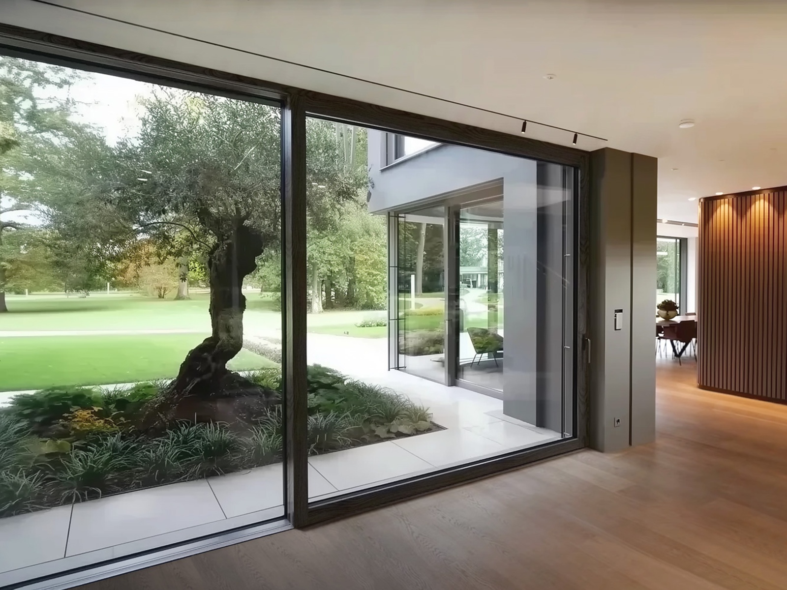 Il sistema può essere installato con il profilo incassato nel muro, creando un design minimalista che riduce la visibilità dei profili e massimizza la trasparenza tra interni ed esterni.