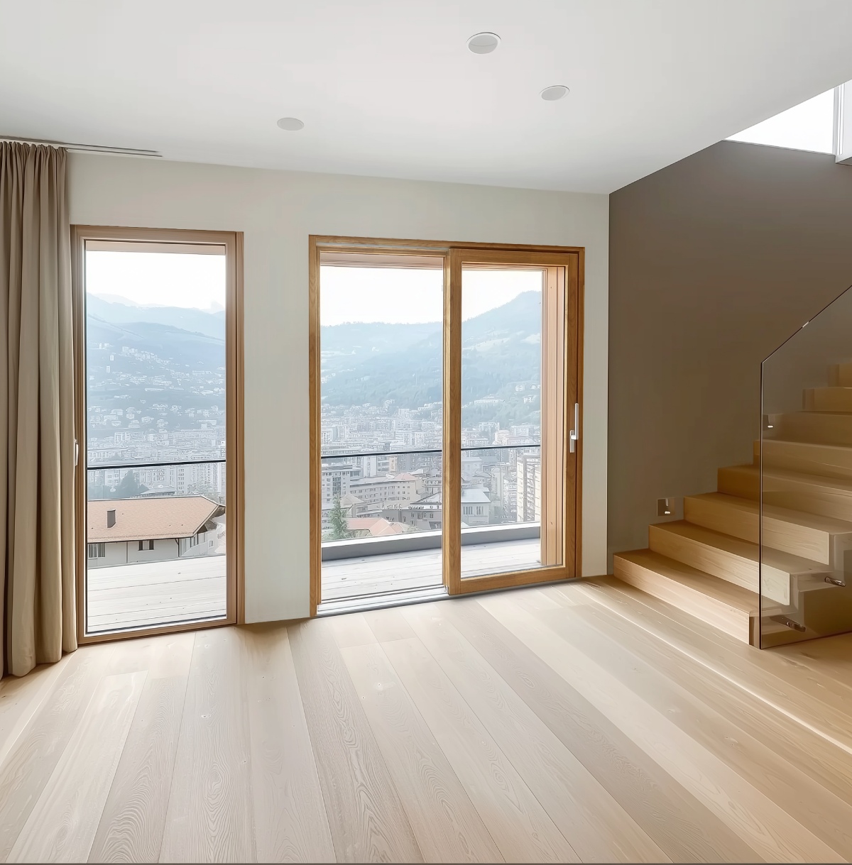HS Lumax è un alzante scorrevole in stile moderno, progettato per avere ampie vedute verso l’esterno, grazie alla parte fissa priva di ingombri. Il legno di rovere conferisce calore e raffinatezza all’ambiente interno.