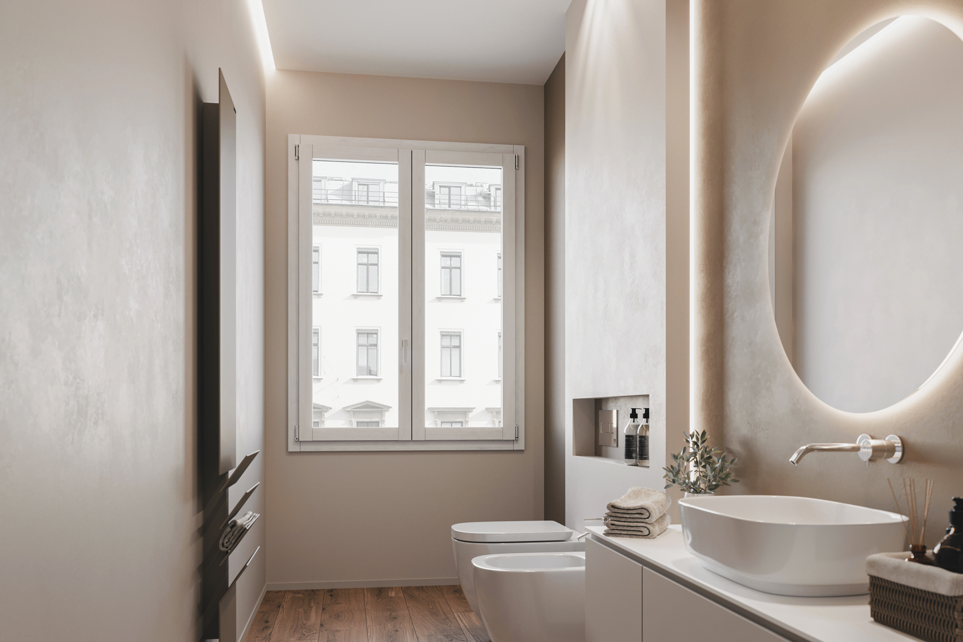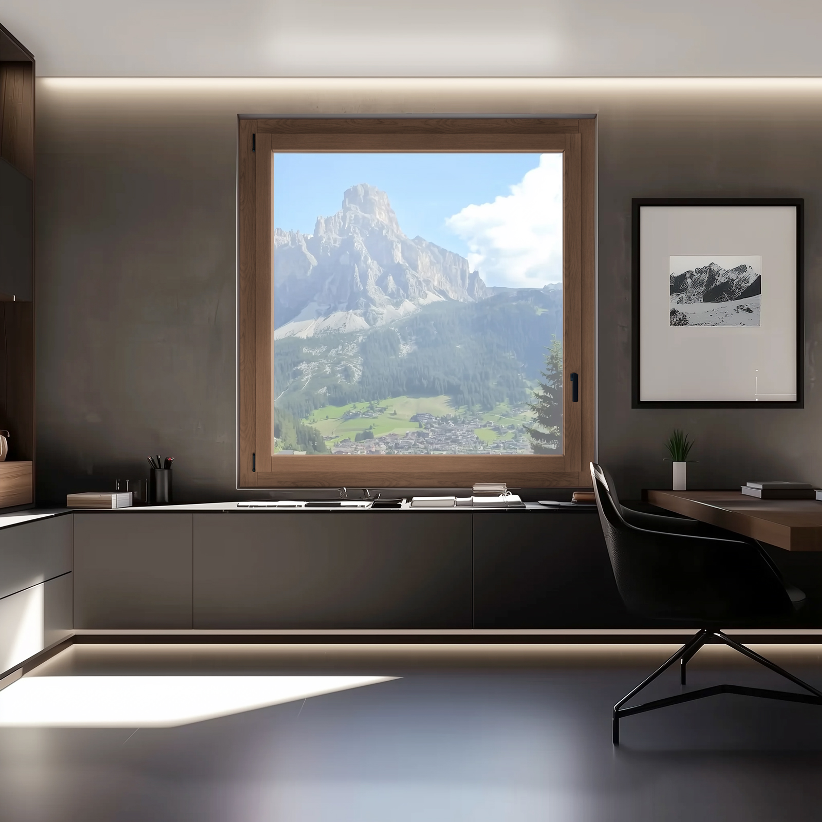 La finestra è caratterizzata da un design moderno e lineare, con il telaio in piano che si integra perfettamente con l'estetica dell'ambiente. Il suo colore richiama il legno corteccia, offrendo una calda sensazione naturale e un tocco elegante. La cerniera è a vista, contribuendo a un look solido e funzionale senza sacrificare l'estetica. La maniglia nera si distingue per il contrasto deciso con la tonalità del telaio, aggiungendo un dettaglio contemporaneo e raffinato.