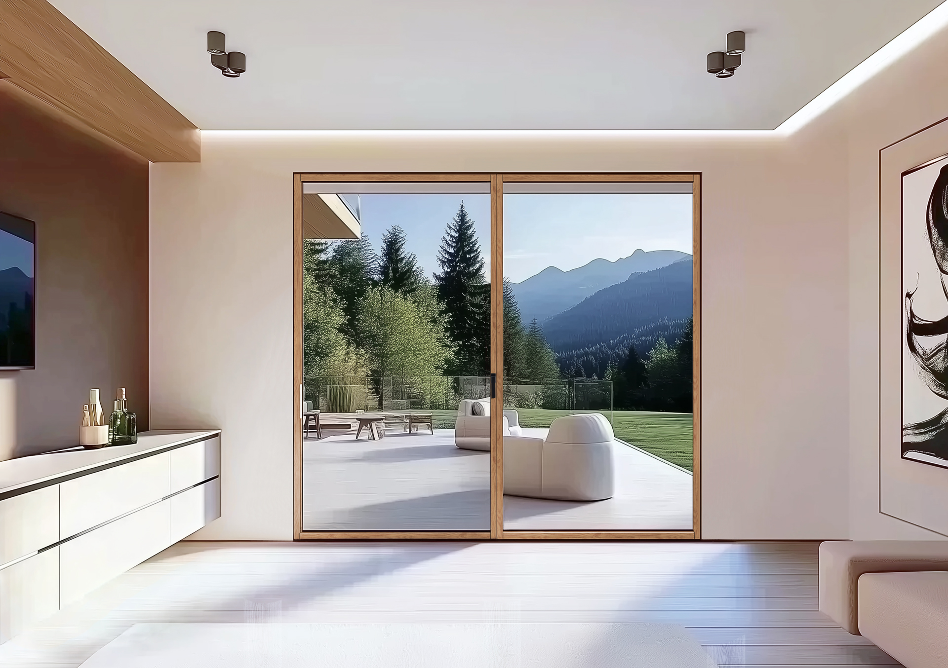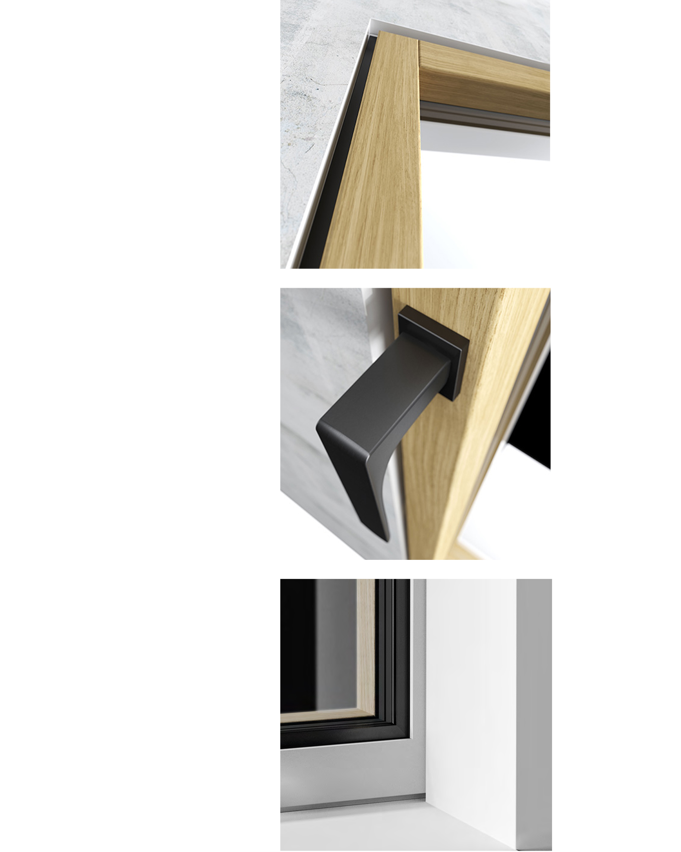 Gli infissi in legno-alluminio, dal design minimale, offrono eccellenti prestazioni termoacustiche grazie al legno interno che isola dal calore, dal freddo e dai rumori